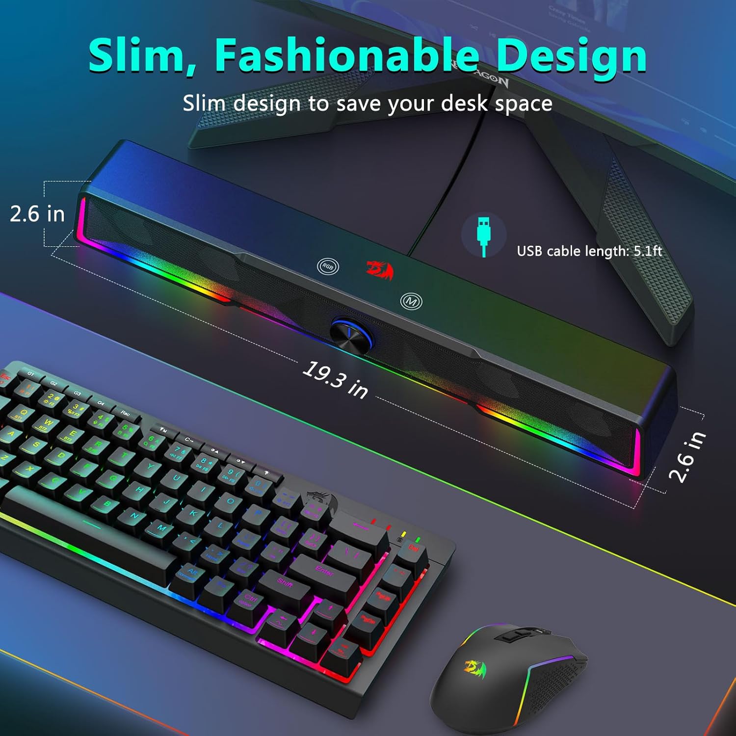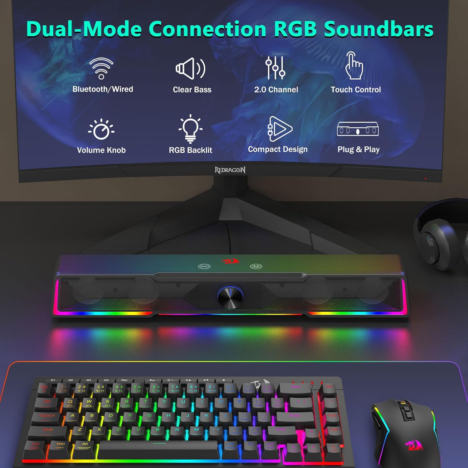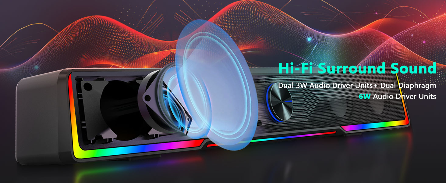 Aukštos kokybės stereo garsas Įrengtas galingas stereo tvarkykles, Black GS516 Bluetooth/USB laidinio ryšio Soundbar garsumo rankenėlės kompiuterio garsiakalbis užtikrina subalansuotą garsą su aiškiu vokalu, detaliu vidutiniu diapazonu ir patobulintu žemųjų dažnių atsaku. Garsiakalbis sukurtas taip, kad sukurtų įtraukiantį garsą įvairių tipų turiniui, įskaitant filmus, žaidimus, podcast'us ir muziką.