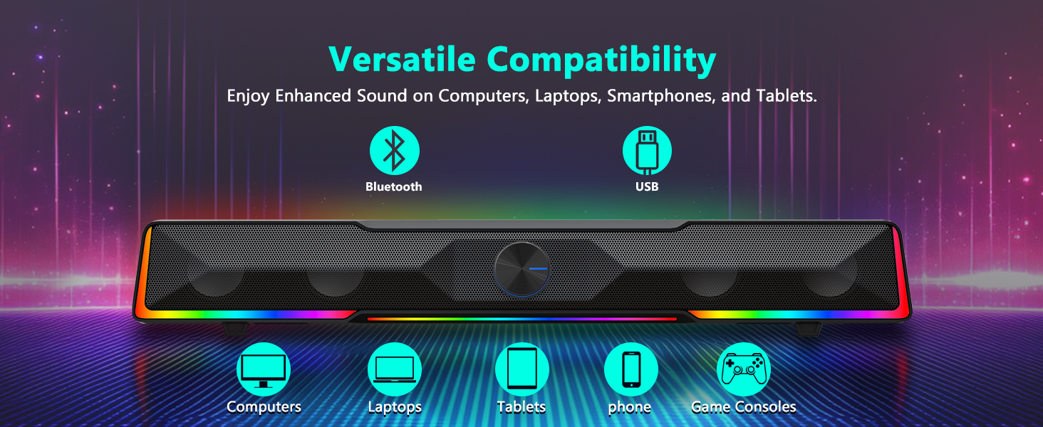 Suderinami įrenginiai Juoda GS516 Bluetooth/USB laidinio ryšio Soundbar garsumo rankenėlė kompiuterio garsiakalbis sukurtas veikti su įvairiausiais įrenginiais. Suderinami įrenginiai paprastai apima:
