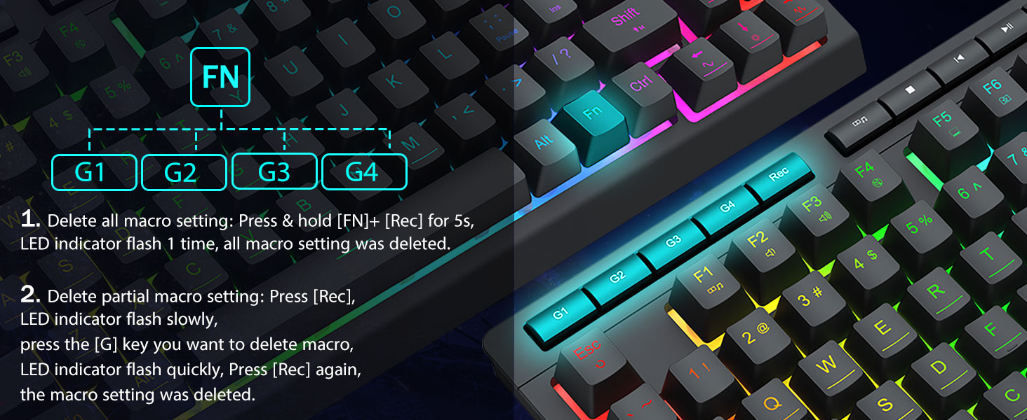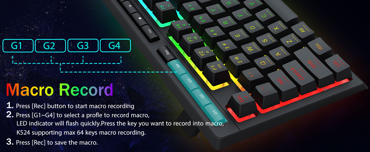4 integruoti makro klavišai –4 integruoti makrokomandos klavišai (G1-G4) yra programuojami ir veikia be jokios papildomos programinės įrangos. Mygtukus lengva redaguoti ir jie gali atlikti įvairias makrokomandas.