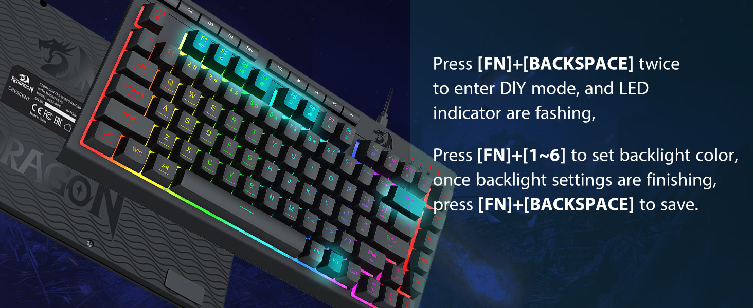 Tikras RGB apšvietimas -Visiškai dinaminis RGB foninis apšvietimas suteikia daugybę apšvietimo galimybių, kurias riboja tik jūsų vaizduotė. Klaviatūroje yra 8 iš anksto nustatyti apšvietimo režimai ir 6 papildomi lizdai pritaikomiems režimams. Plokštė taip pat leidžia valdyti ryškumą, kuris svyruoja nuo labai ryškaus iki visiškai išjungto, jei jums nereikia apšvietimo.