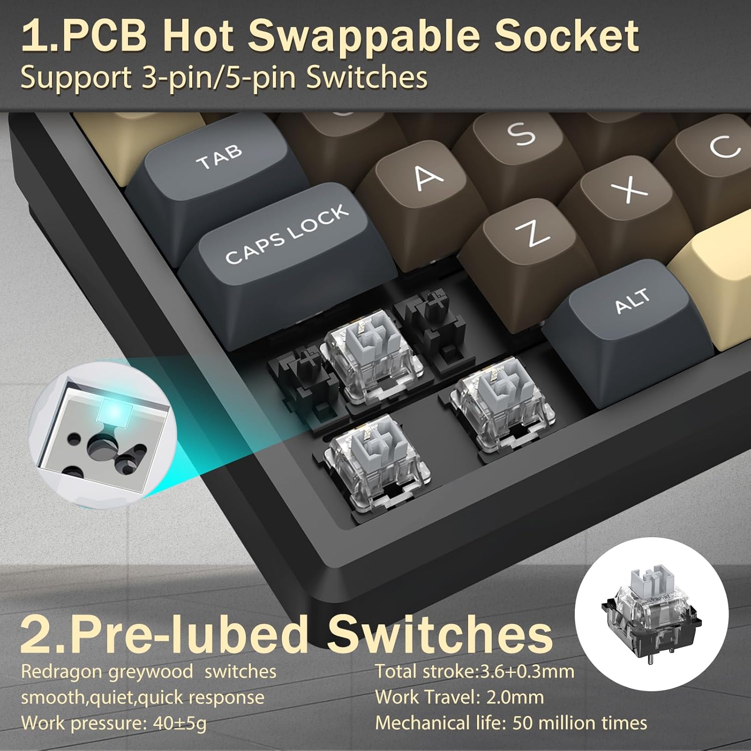 Juoda K727 60 % belaidė mechaninė žaidimų klaviatūra siūlo praktišką kompaktiško dizaino, mechaninio veikimo ir lankstaus ryšio derinį. Dėl supaprastinto išdėstymo, patikimo įvesties ir patvarios konstrukcijos jis tinka daugeliui vartotojų.
