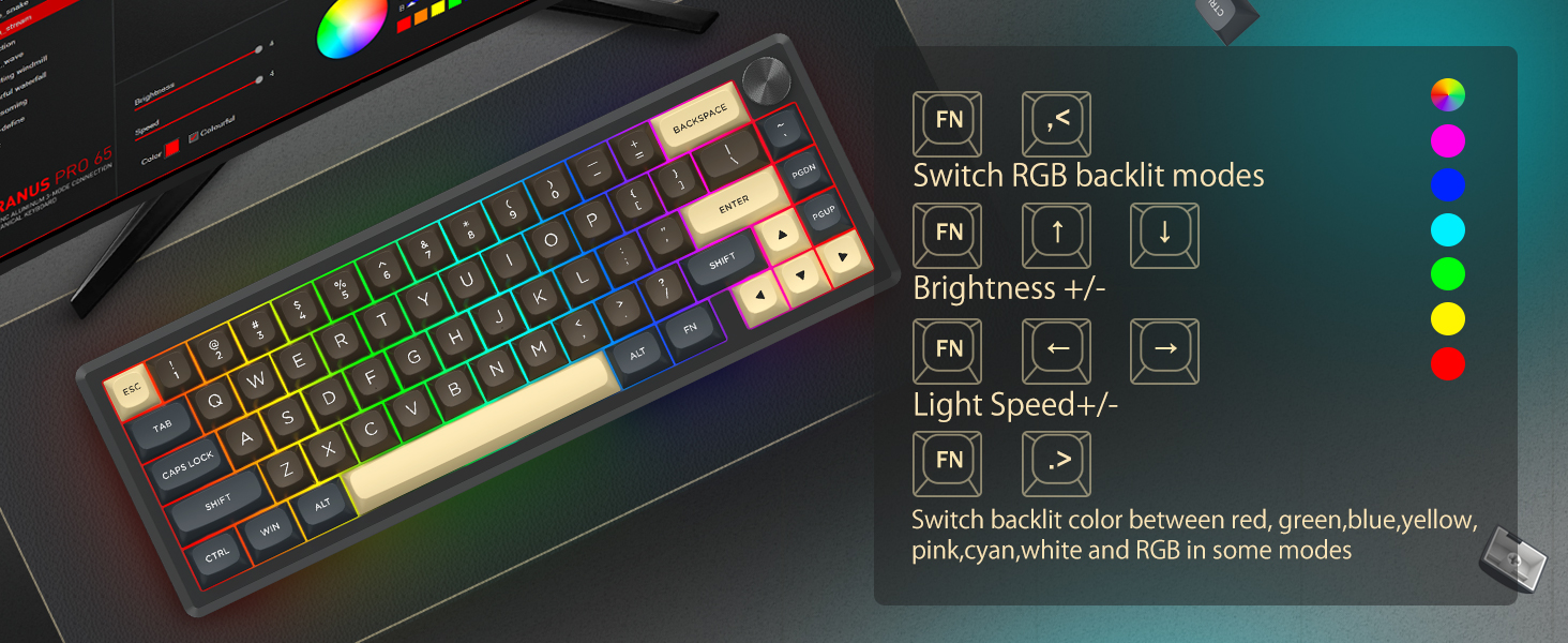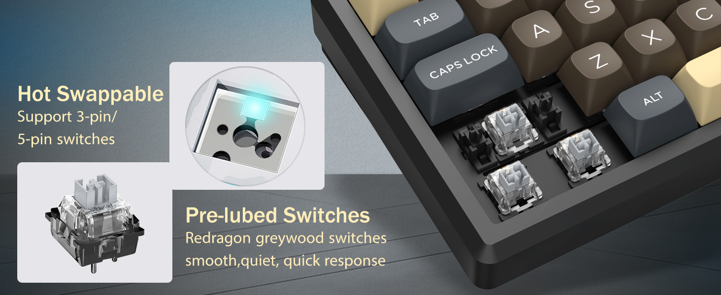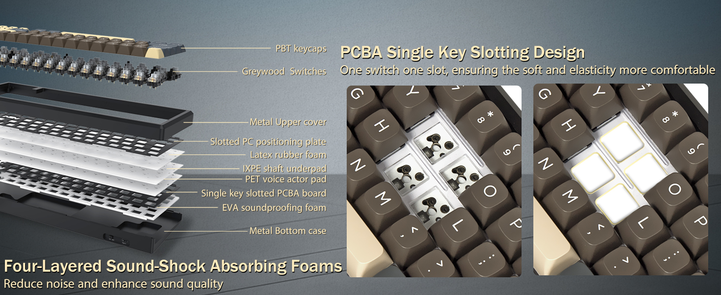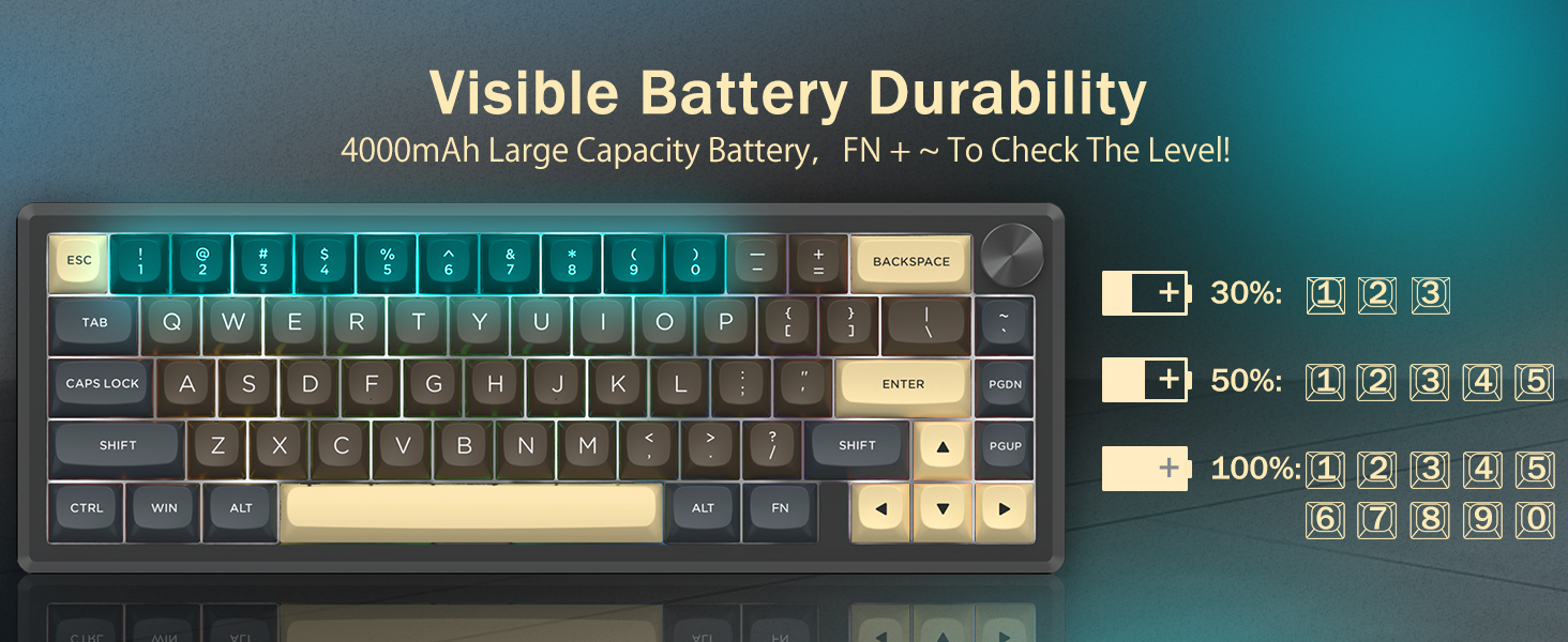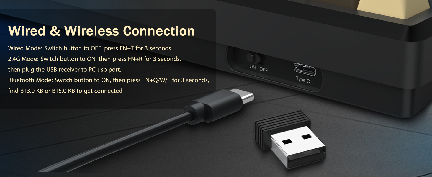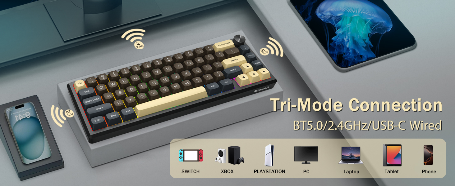 Klaviatūra palaiko belaidį ryšį patogumui ir laidinį USB ryšį, kad veiktų stabiliai. Vartotojai gali perjungti režimus, priklausomai nuo jų sąrankos.