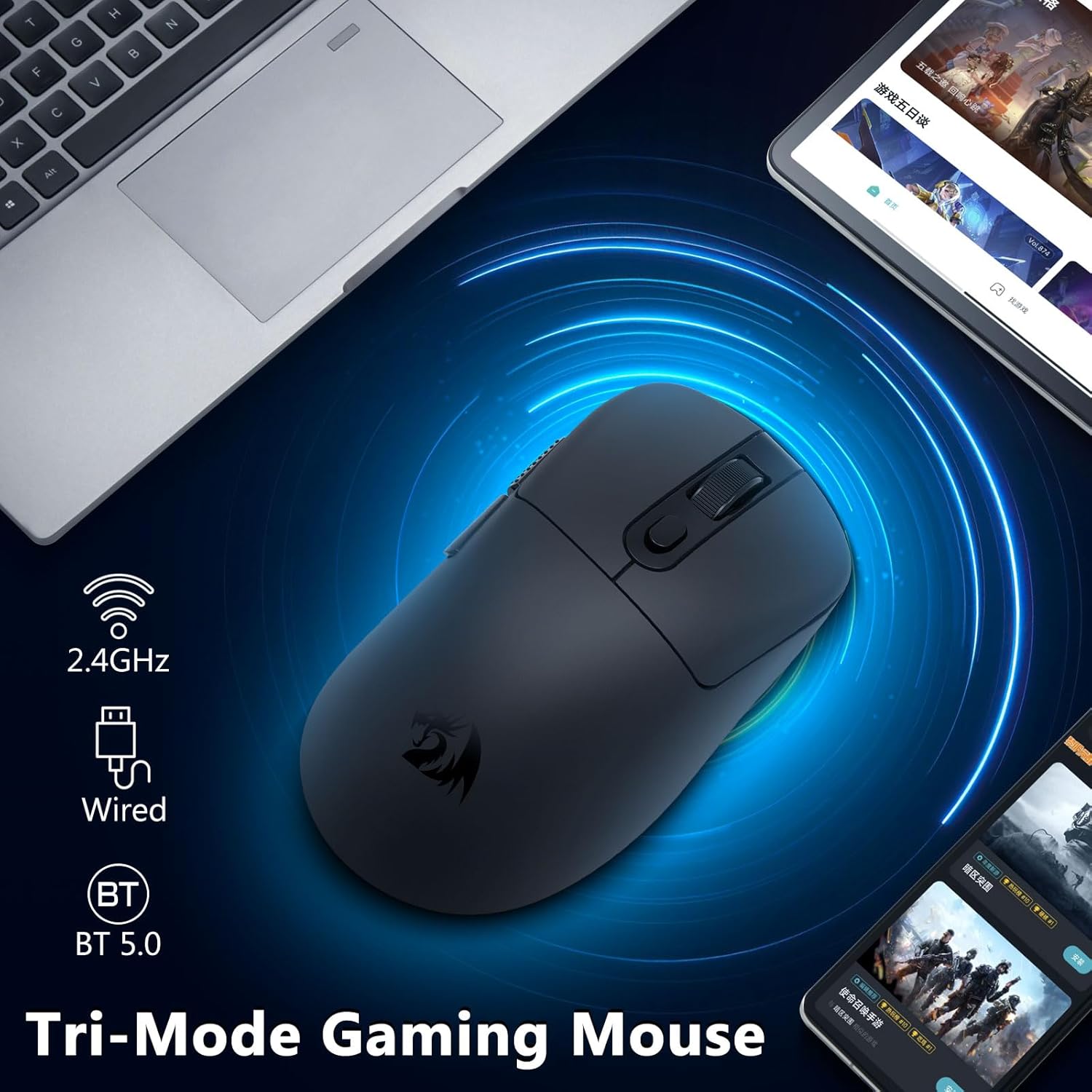 CHUANGQUAN Black M818 Wireless 24 000 DPI, Tri-Mode 2.4G žaidimų pelė užtikrina tikslų stebėjimą, lankstų ryšį ir sklandų valdymą, idealiai tinka žaidėjams ir profesionalams, ieškantiems greičio, tikslumo ir sklandaus kelių įrenginių veikimo.