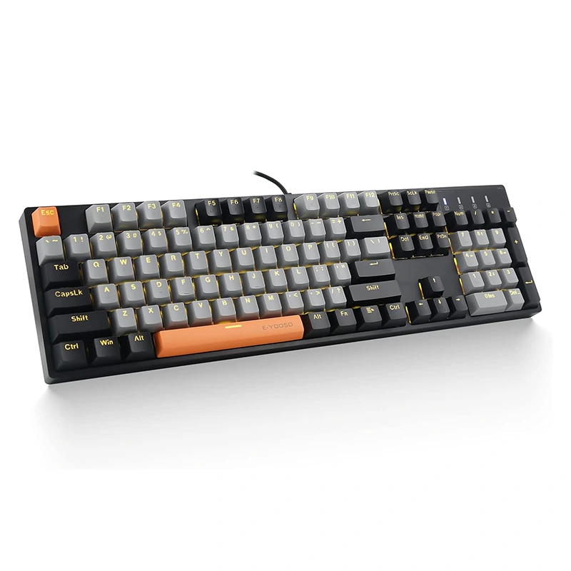 E-YOOSO Z-14 104 klavišų viso dydžio vientisa geltona apšviesta mechaninė žaidimų klaviatūra su raudonu jungikliu. Gera tekstūra, prieinama kaina, galima žaisti žaidimus ir dirbti kartu