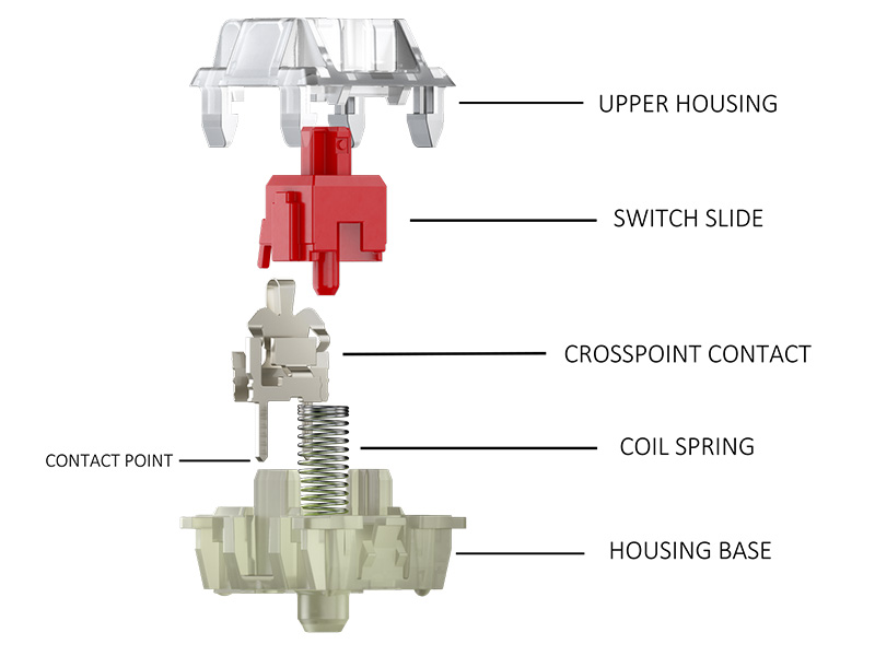 Linijinių jungiklių dizainas siekia sumažinti pasipriešinimo trukdžius. Struktūrinis skirtumas tarp tiesinių ir lytėjimo jungiklių pasireiškia įjungimo mechanizmuose: linijiniai jungikliai naudoja lygų stiebo kreipiamąjį bėgius ir tiesias cilindrines spyruokles, be jokių iškilimų ar žingsnių prie stiebo pagrindo. Paspaudus stiebas nusileidžia tiesiškai, o atsparumas spyruoklėms tolygiai didėja. Taktiliniai jungikliai, priešingai, sukuria staigius taktilinius pokyčius per mechanines struktūras-mėlynių jungiklių jungikliai naudoja ritės spyruoklę ir kryžminio taško kontaktą, kuris išleidžia kinetinę energiją vidurio smūgio metu, sukuriant dviejų pakopų „paspaudimą“ su tariamu lytėjimo grįžtamuoju ryšiu ir garsu. Šie struktūriniai skirtumai tiesiogiai apibrėžia jų lytėjimo profilius: linijiniai jungikliai suteikia sklandumo su pasipriešinimo kreivėmis, o lytėjimo jungikliai tyčia sukuria pastatytus grįžtamąjį ryšį, skirtą interaktyvesniam spausdinimo ritmui.