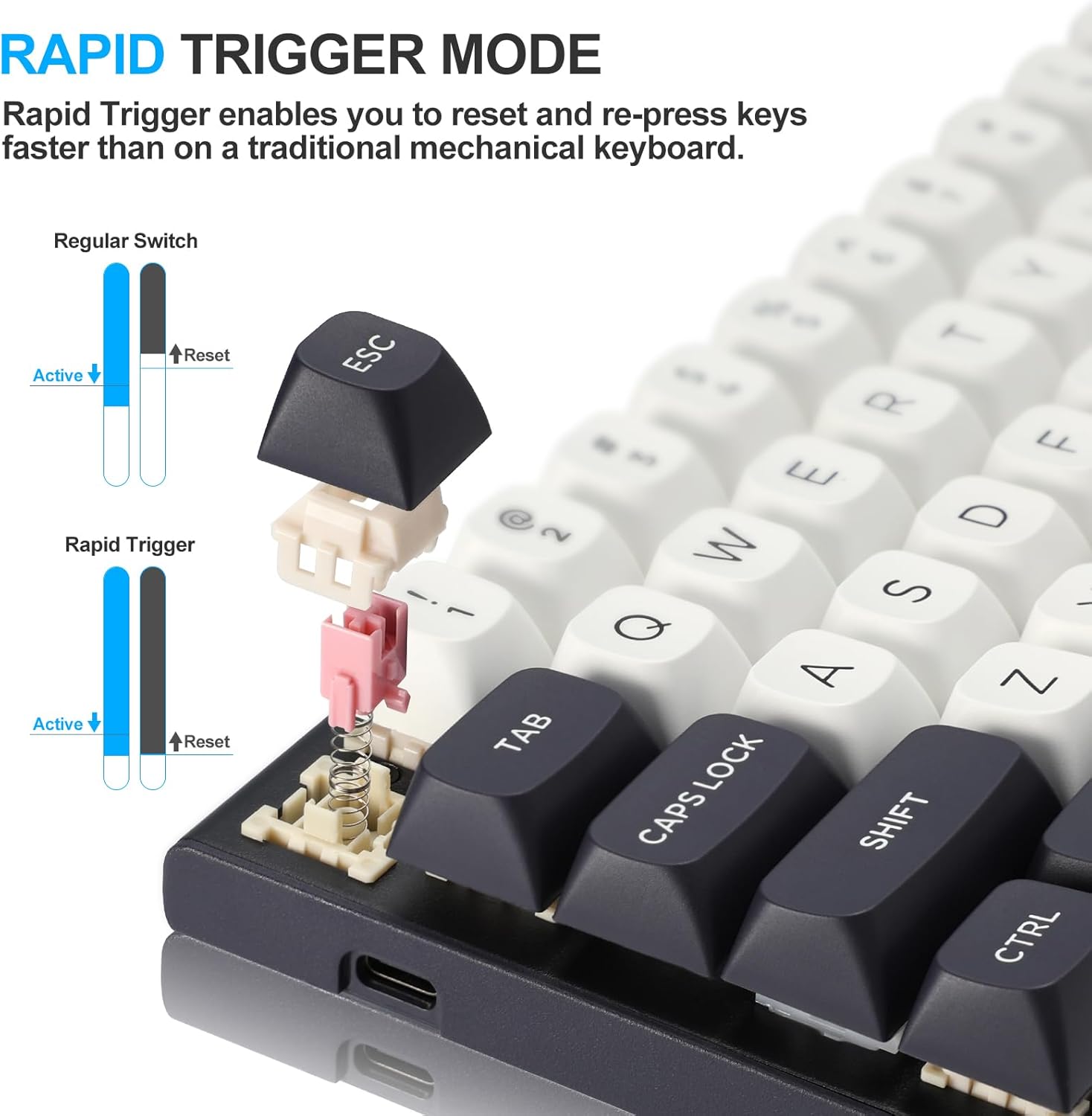Balta/mėlyna-juoda K701 greitojo trigerio 60 % laidinio magnetinio jungiklio mechaninė žaidimų klaviatūra siūlo jautrų spausdinimą, kuris prisitaiko prie skirtingų vartotojų pageidavimų. Reguliuojami paleidimo taškai leidžia vartotojams tiksliai sureguliuoti jautrumą pagal savo poreikius.