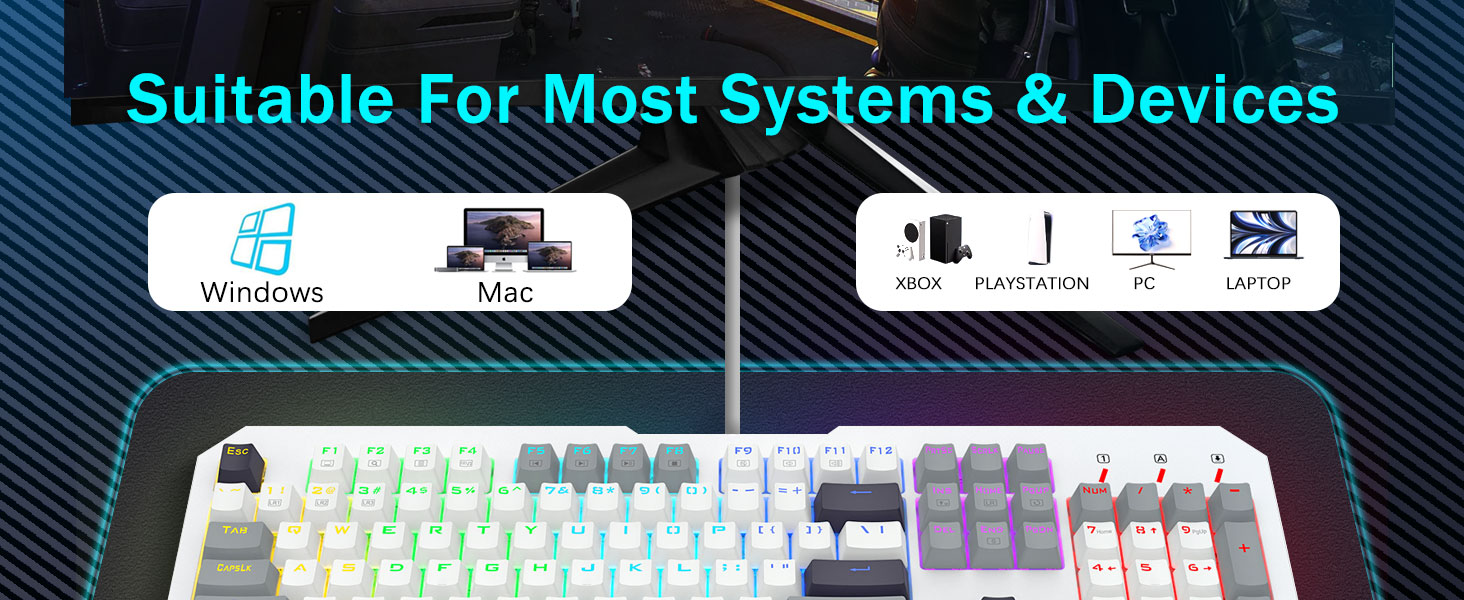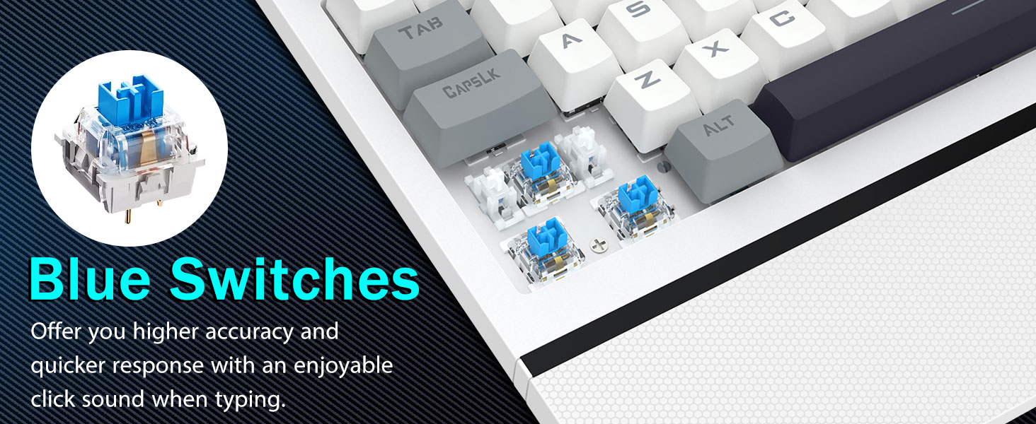 【Reaguojantys mėlyni jungikliai tiksliam rašymui】Mūsų kompiuterio klaviatūroje yra spragtelėję mėlyni jungikliai, užtikrinantys žaibą – greitą reagavimo laiką ir nepaprastą tikslumą. Kiekvienas klavišo paspaudimas skleidžia malonų paspaudimo garsą, kuris pagerina spausdinimo patirtį. Dėl gilesnės klavišų eigos, stipresnio grįžtamojo ryšio ir didesnio tarpo tarp klavišų spausdinimas yra ne tik tikslesnis, bet ir daug patogesnis. Jei esate tokio lytėjimo, „spustelėjimo“ jausmo gerbėjas, mūsų klaviatūra yra puikus pasirinkimas jums.