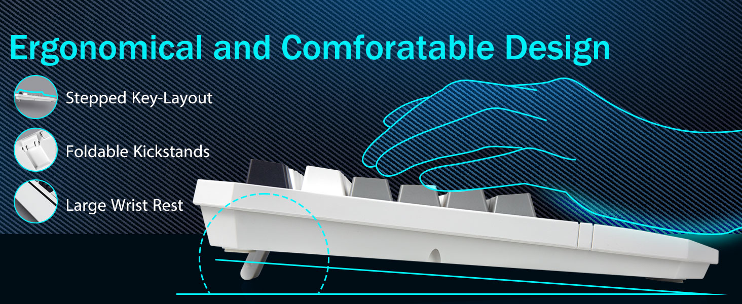 【Pažangi ergonomika, užtikrinanti komfortą visą dieną】Sukurta atsižvelgiant į jūsų patogumą, mūsų kompiuterinių žaidimų klaviatūra pasižymi moksliniu laiptų viršaus klaviatūros išdėstymu ir erdvia riešo atrama. Ši sąranka išlaiko jūsų rankas natūralioje padėtyje ir sumažina rankų nuovargį ilgai naudojant. Laidinėje klaviatūroje taip pat yra 2 tvirti, sulankstomi galiniai stovai, leidžiantys reguliuoti nuolydį, kad laikysena būtų optimali.