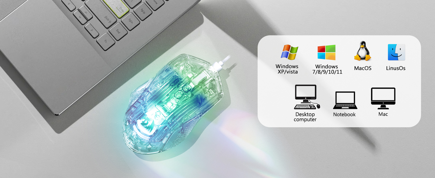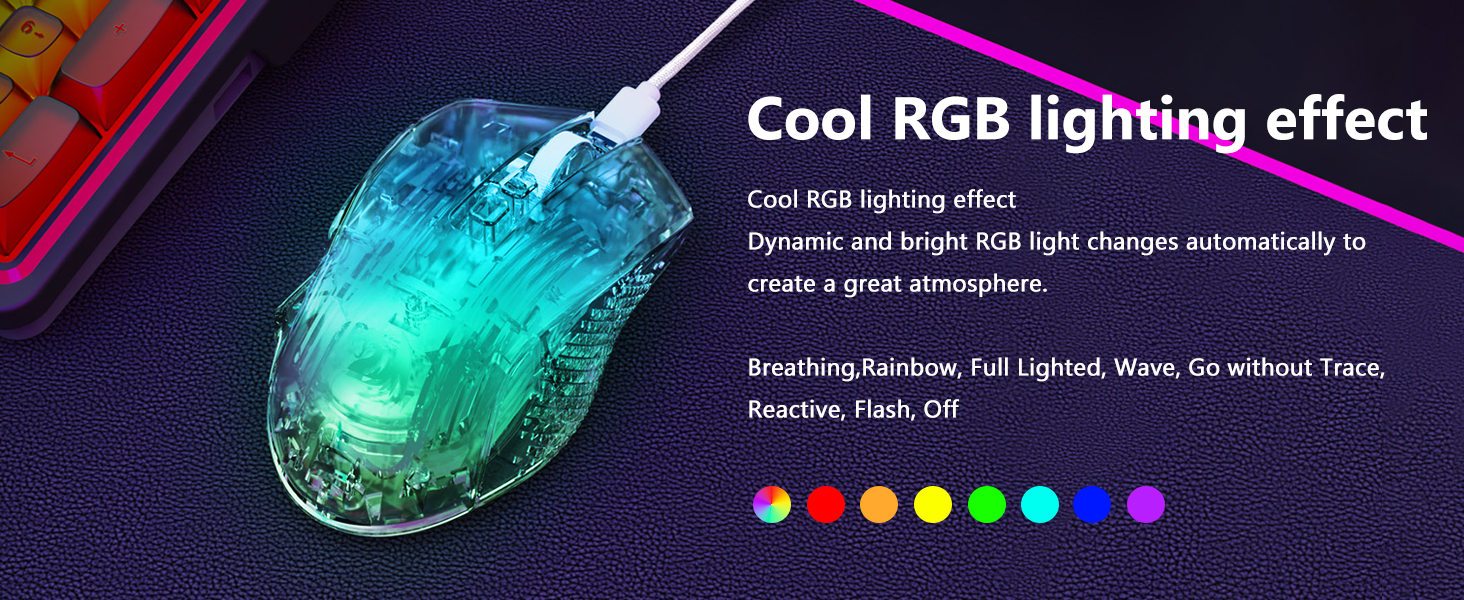 Pelėje yra aštuoni RGB apšvietimo efektai, kurie pagerina vizualinį patrauklumą nepakenkiant veikimui. Vartotojai gali perjungti apšvietimo režimus, kad atitiktų savo nustatymus ar asmeninius pageidavimus.
