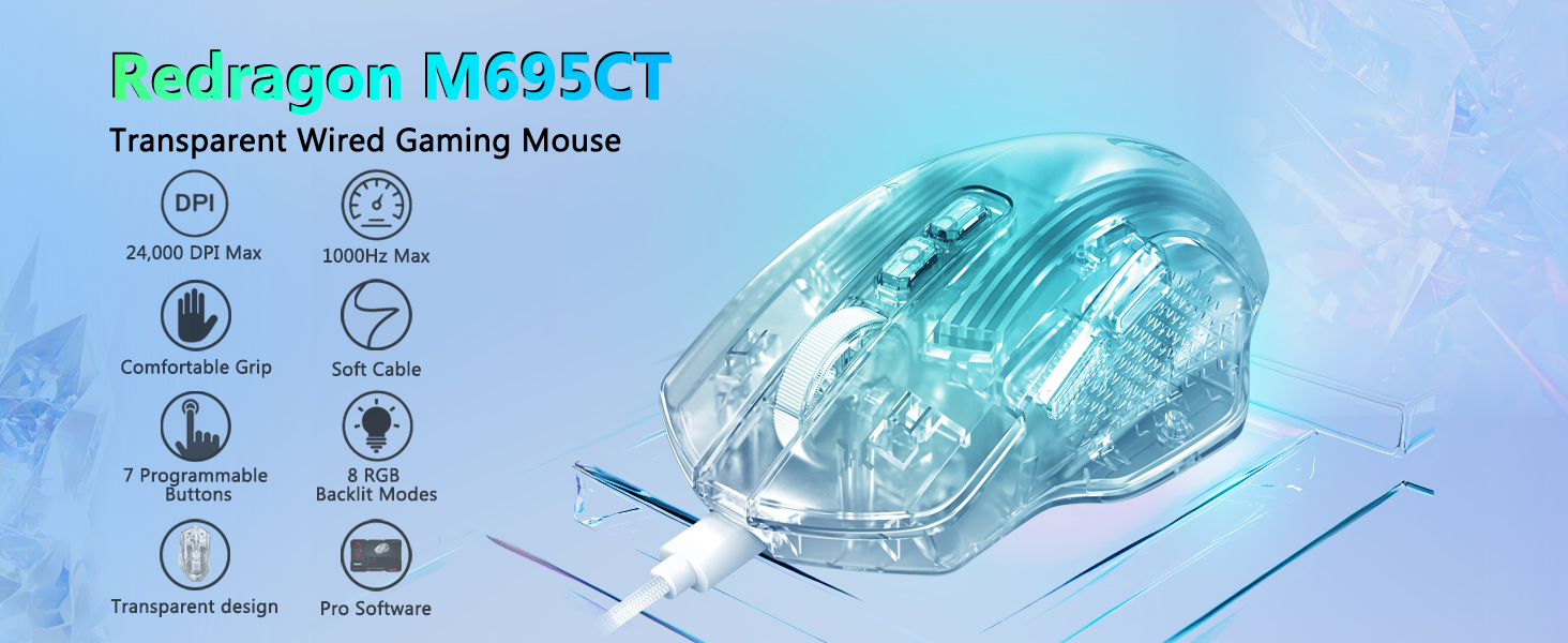 Balta M695CT 24 000 DPI 8 RGB LED foninio apšvietimo režimo laidinė žaidimų pelė, turinti patikimą laidinį ryšį ir praktiškų funkcijų rinkinį, yra patikimas pasirinkimas vartotojams, ieškantiems nuoseklaus valdymo ir efektyvaus našumo šiuolaikinėje skaičiavimo aplinkoje.