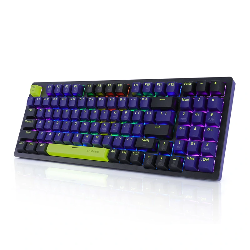2. 2. Puikus raudonas jungiklis ir bule jungiklis: E-OOSO mechaninė klaviatūra naudoja rRed jungiklį ir bule jungiklį, 50 milijonų klavišų paspaudimų tarnavimo laikas, 2,0 mm atstumas iki paleidimo, 45 g įjungimo jėga 3. Karštuoju būdu keičiamas ir dvigubas įpurškimo klavišų dangtelis: karštas keitimas PCB leidžia laisvai pakeisti 3 kontaktų jungiklius be litavimo problemų