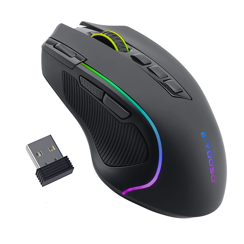 „E-Yooso“ belaidžio žaidimų pelės turi 8000 DPI optinį jutiklį ir IT su RGB apšvietimu. Yra belaidžių žaidimų pelės RGB 9 programuojami mygtukai su makrokomandos šoniniais mygtukais, greita ugnies mygtuku